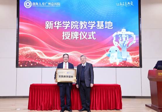 随后,在与会嘉宾的共同见证下,广州新华学院副校长胡卓加与前海人寿广州总医院党委书记、副院长寇秋野代表双方签署了教学基地合作协议;在全场热烈掌声中,王庭槐校长向医院授予“广州新华学院实践教学基地”牌匾,这一牌匾不仅是合作关系的象征,更是双方共同培养医学人才的责任承诺。