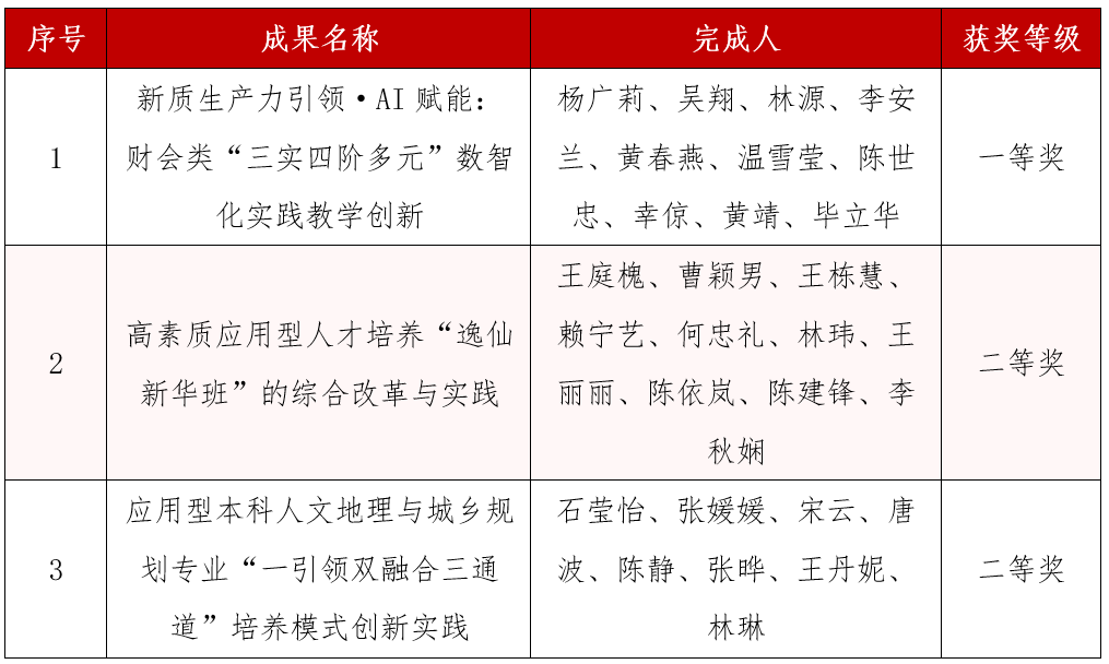 教学成果奖是对学校人才培养工作和教育教学改革成果的检阅和展示。长期以来,学校始终坚持以人才培养为中心,将教学成果培育作为深化教学改革、提升办学质量的核心抓手,持续加强专业内涵建设,全力推动教育教学研究与实践深度融合。此次多项成果获奖,既是学校在人才培养、学科建设、教育教学改革等领域扎实成效的集中彰显,也凝聚着全校教师团队深耕教学、潜心科研、勇于创新的辛勤付出。