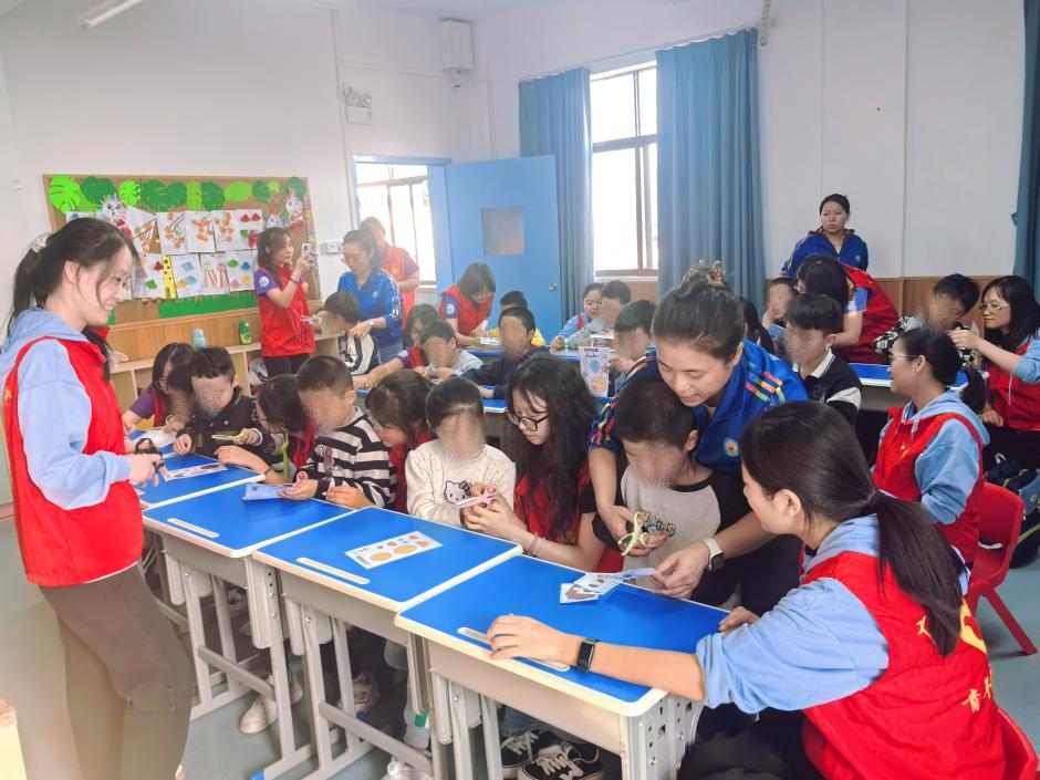 镜头2定格在融合班正在进行的语言交流活动,志愿者们通过简单有趣的故事、绘本共读、词汇卡片配对、简单问答等形式,志愿者耐心引导孩子发音、模仿、表达需求。“要水”“老师好”“我开心”……一句句短语虽稚嫩,却是沟通世界的珍贵密码。每一次开口,都被掌声与拥抱温柔接住。