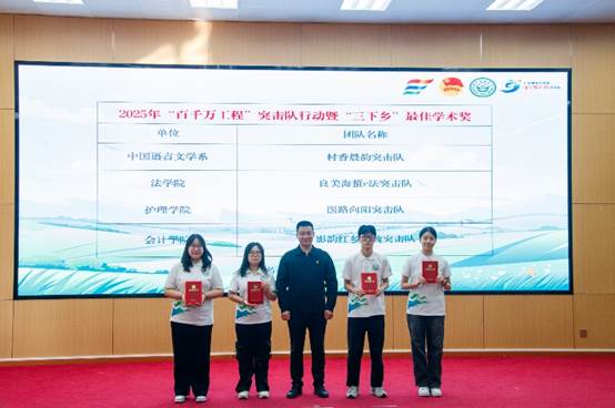 大会特别邀请了在2025年暑期“三下乡”社会实践活动中表现突出的优秀团队进行实践成果展示。药学院药香南澳突击队、康复医学系郁见“脊”康突击队、管理学院古围红耕突击队及艺术与传媒学院艺新艺邑突击队等团队,纷纷借助PPT展示等丰富多样的形式,生动分享了他们在“三下乡”实践过程中的宝贵经验与深刻感悟。这些鲜活的实践案例和切实可行的经验,为同学们参与社会实践提供了极具价值的参考与借鉴。